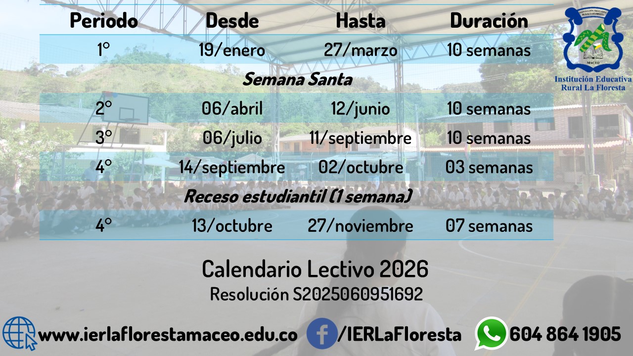 La Institución Educativa Rural La Floresta es una entidad de servicio público Educativo que atiende a niños, niñas, jóvenes y adultos, en los niveles de preescolar, básica y media académica en jornada diurna y nocturna; como centro de formación integral con liderazgo comunitario, sentido de inclusión, emprendedora, comprometidos con su medio ambiente y entorno social.